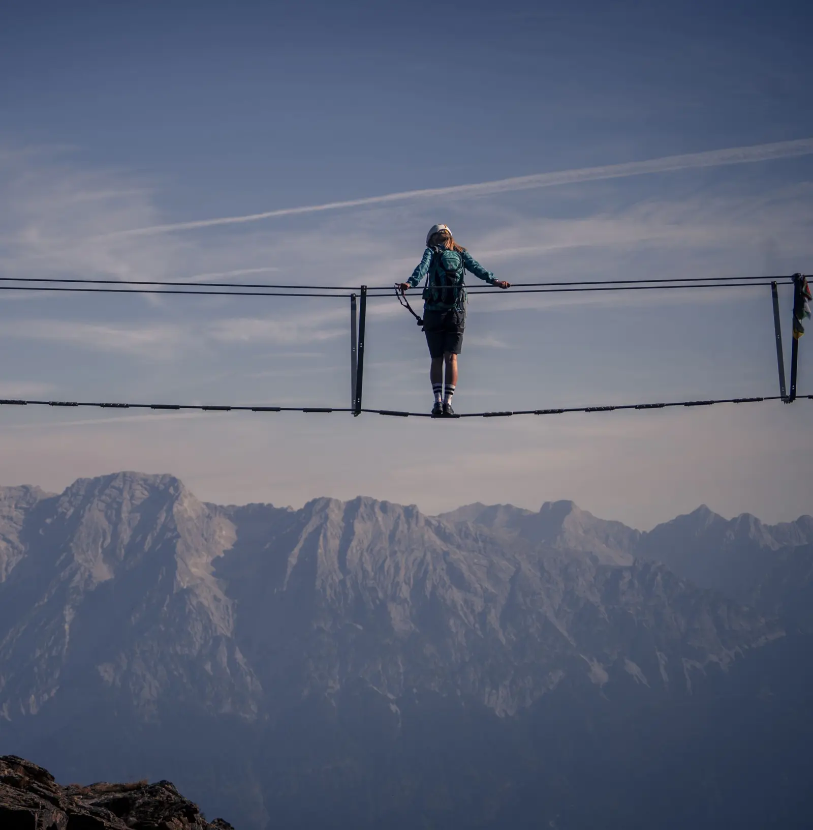 Wer sich unsicher fühlt oder keine eigene Ausrüstung besitzt, kann sich an der Talstation der Glungezerbahn mit Klettersteigset, Gurt und Helm ausstatten – und einen Guide hinzuziehen.